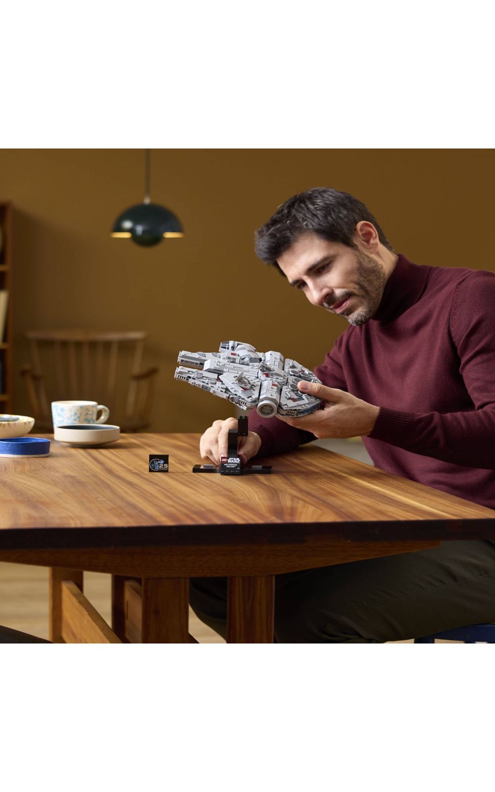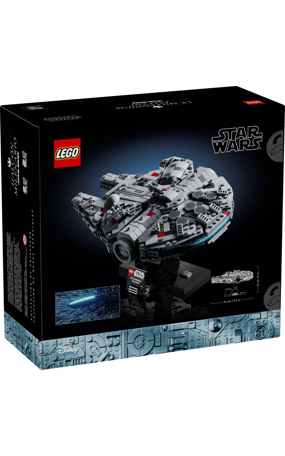 Construir e exibir Esta nave LEGO® Star Wars Millennium Falcon mede mais de 13 cm (5 pol.) de altura, 24 cm (9,5 pol.) de comprimento e 19 cm (7,5 pol.) de largura