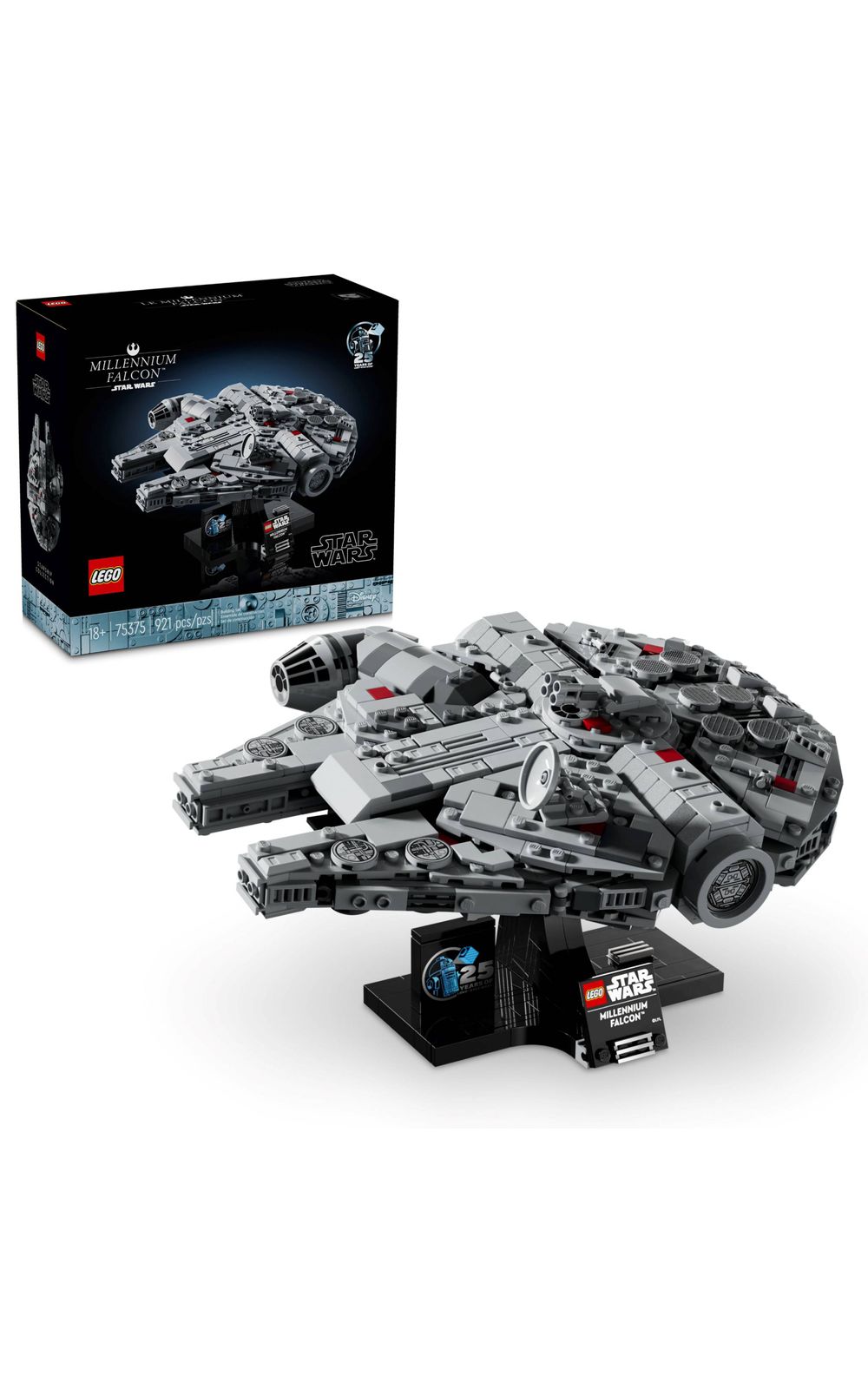 Feito para exibição O suporte para construir tem uma placa de identificação e peças LEGO® Star Wars do 25º aniversário e foi projetado para exibir a Millennium Falcon em um ângulo dinâmico