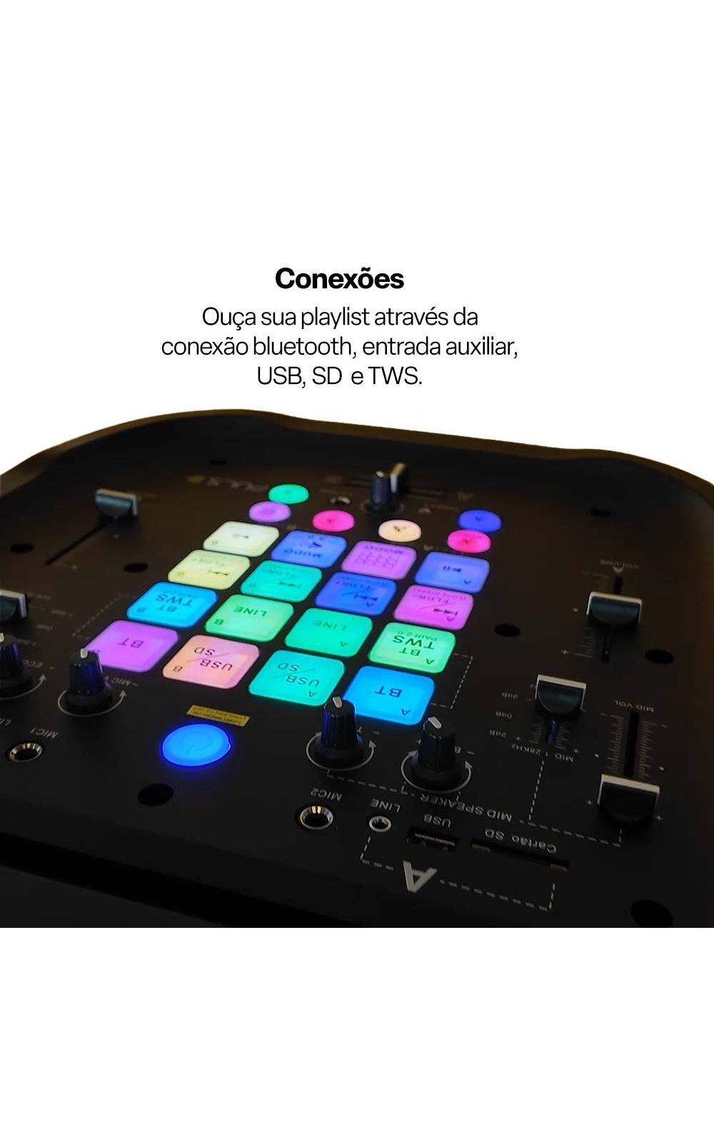Conexão para dois microfones, Bluetooth 5.0, AUX, USB e SD.