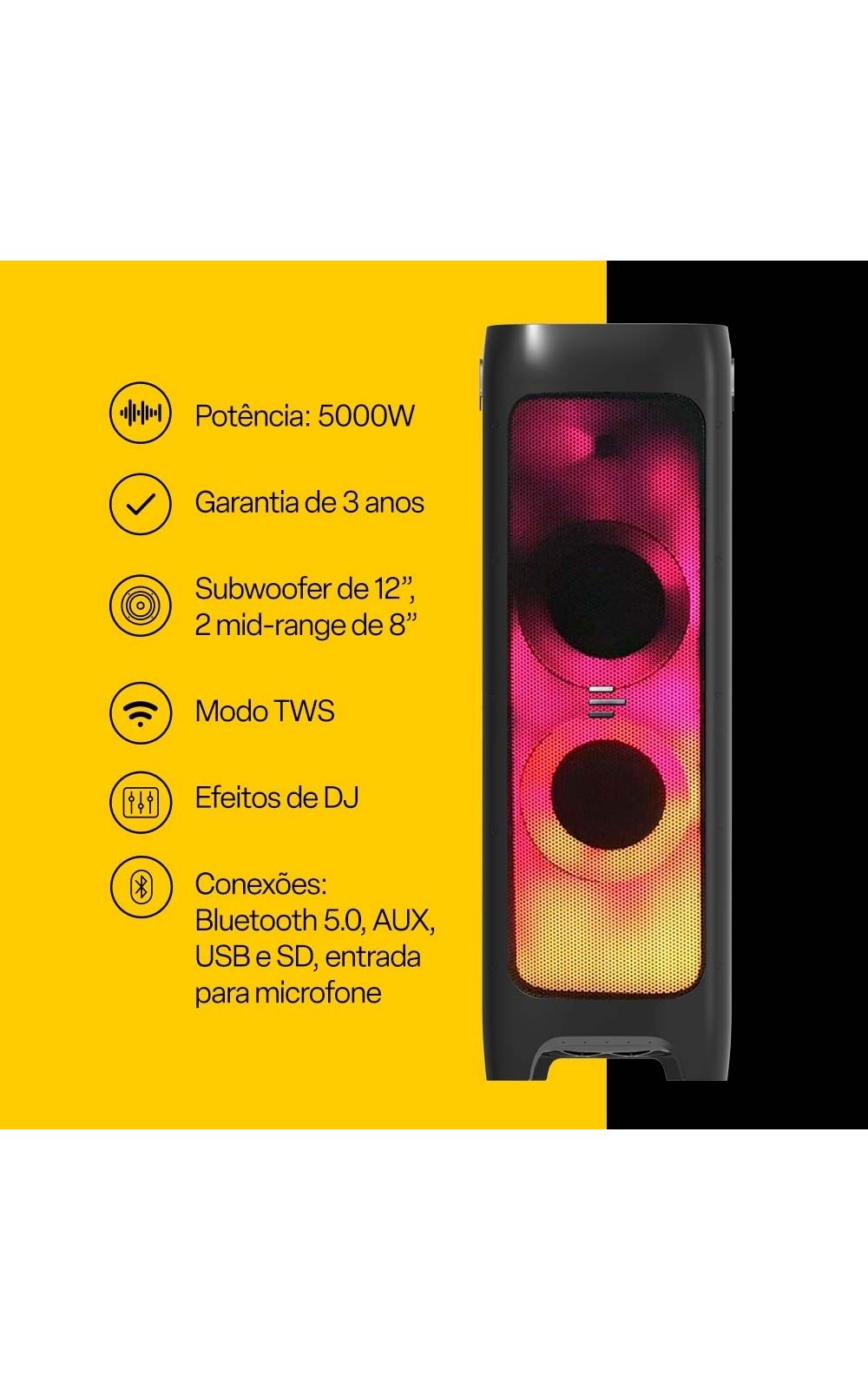 5000W de potência, 2 alto-falantes de