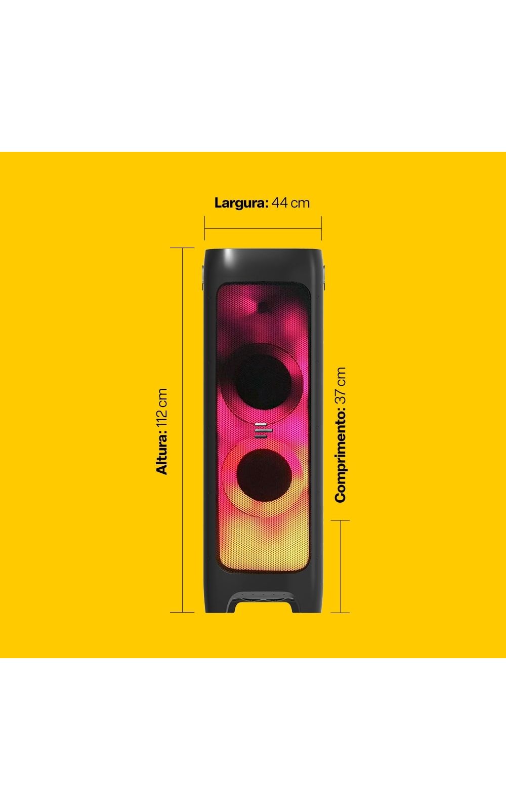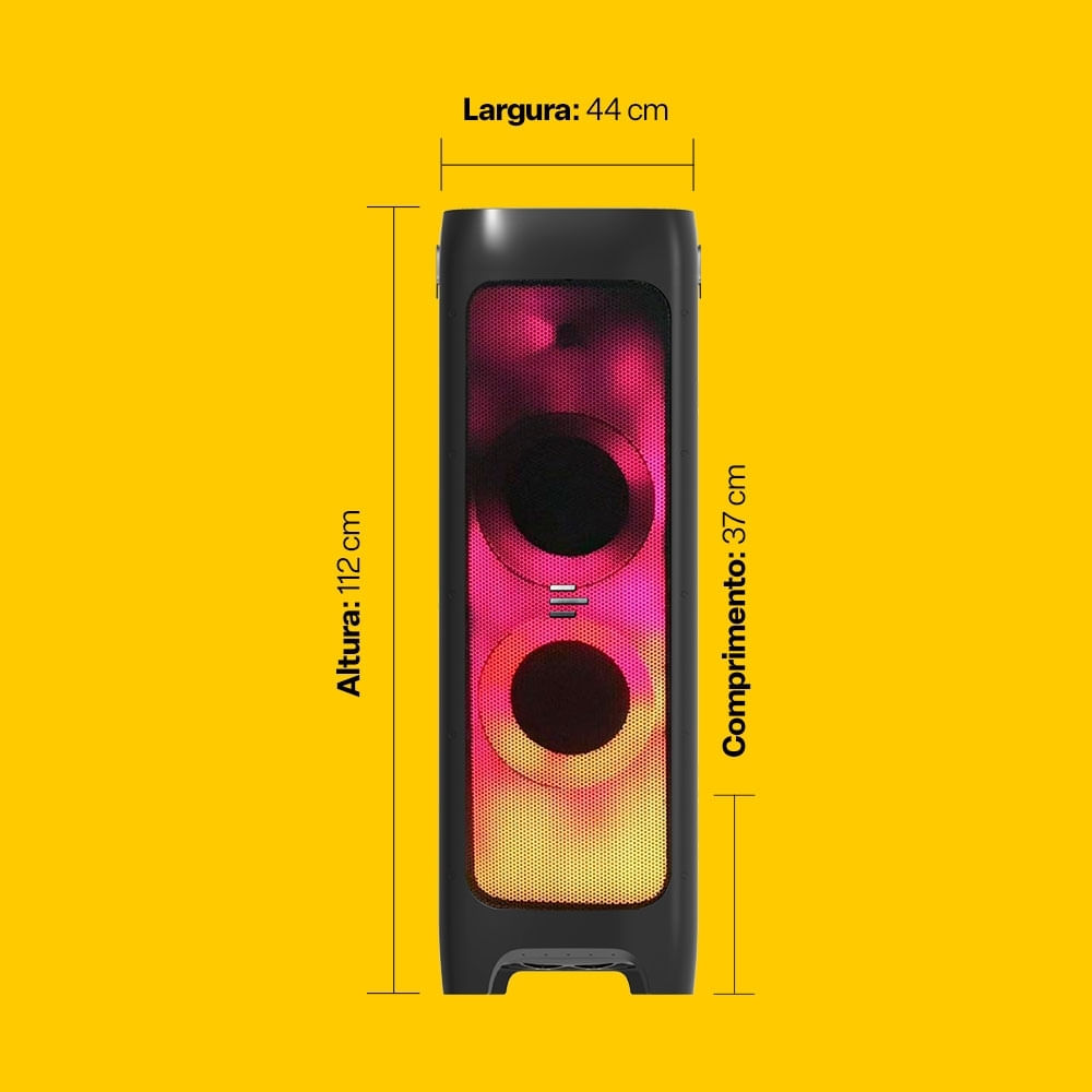 AUX, USB e SD.*Não inclusos.Além disso tudo, ela ainda tem:Rodinhas para transporte: A gigante de som que anda com você; Proteção IPX4: Proteção resistente à respingos de água; Conexão para TV: Conecte à TV por Bluetooth ou por cabos; Bivolt: Funciona em tomadas mais comuns (127V ou 220V).