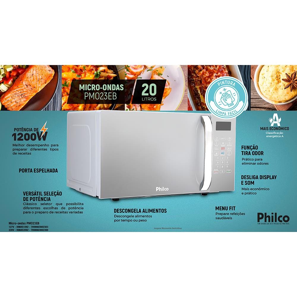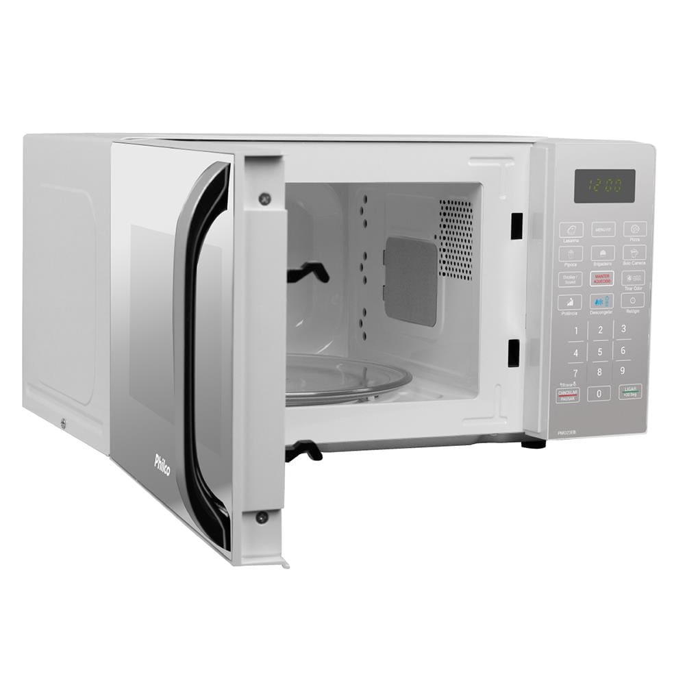 O Micro-ondas Philco PMO23EB 20 Litros é um grande aliado na rotina culinária. Fabricado na cor prata e com potência de 1100W, ele traz variadas funções que facilitam o dia a dia na cozinha. Sua pintura especial não permite que a sujeira grude nas paredes internas do micro-ondas, facilitando a limpeza do mesmo. Com capacidade para 20 litros de espaço interno, o forno conta com função Display/Sound, que ao pressionar o botão uma vez desliga o visor, se pressionar e segurar o botão por 3 segundos, o som do teclado desligará. Além disso, o Menu FIT é possível cozinhar batata, sopa e legumes ao utilizar esta função.