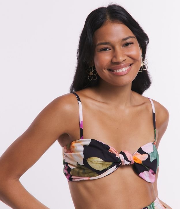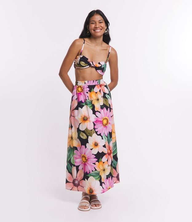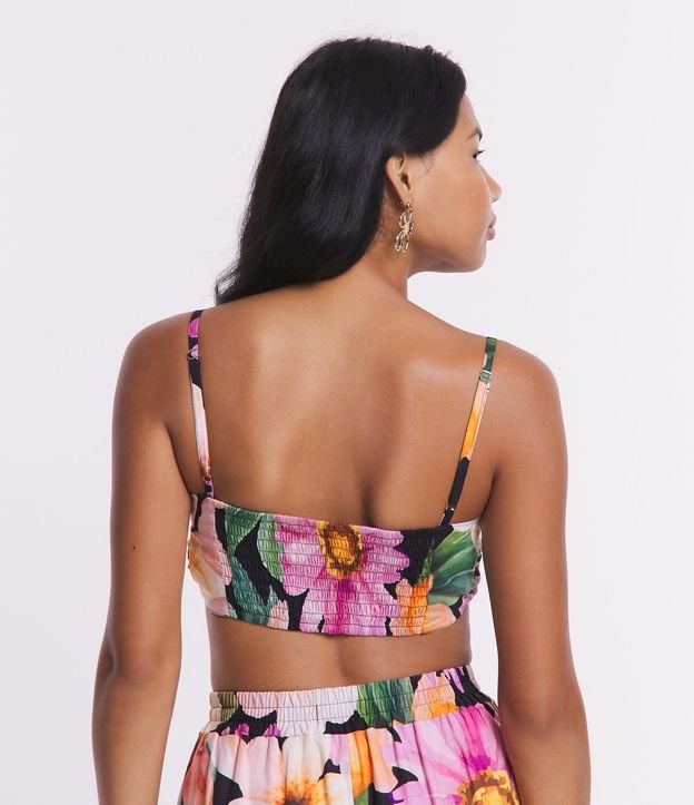 Top de alcinhas finas reguláveis confeccionado em tricoline com decote torcido, lastex nas costas e flores aquareladas estampadas.